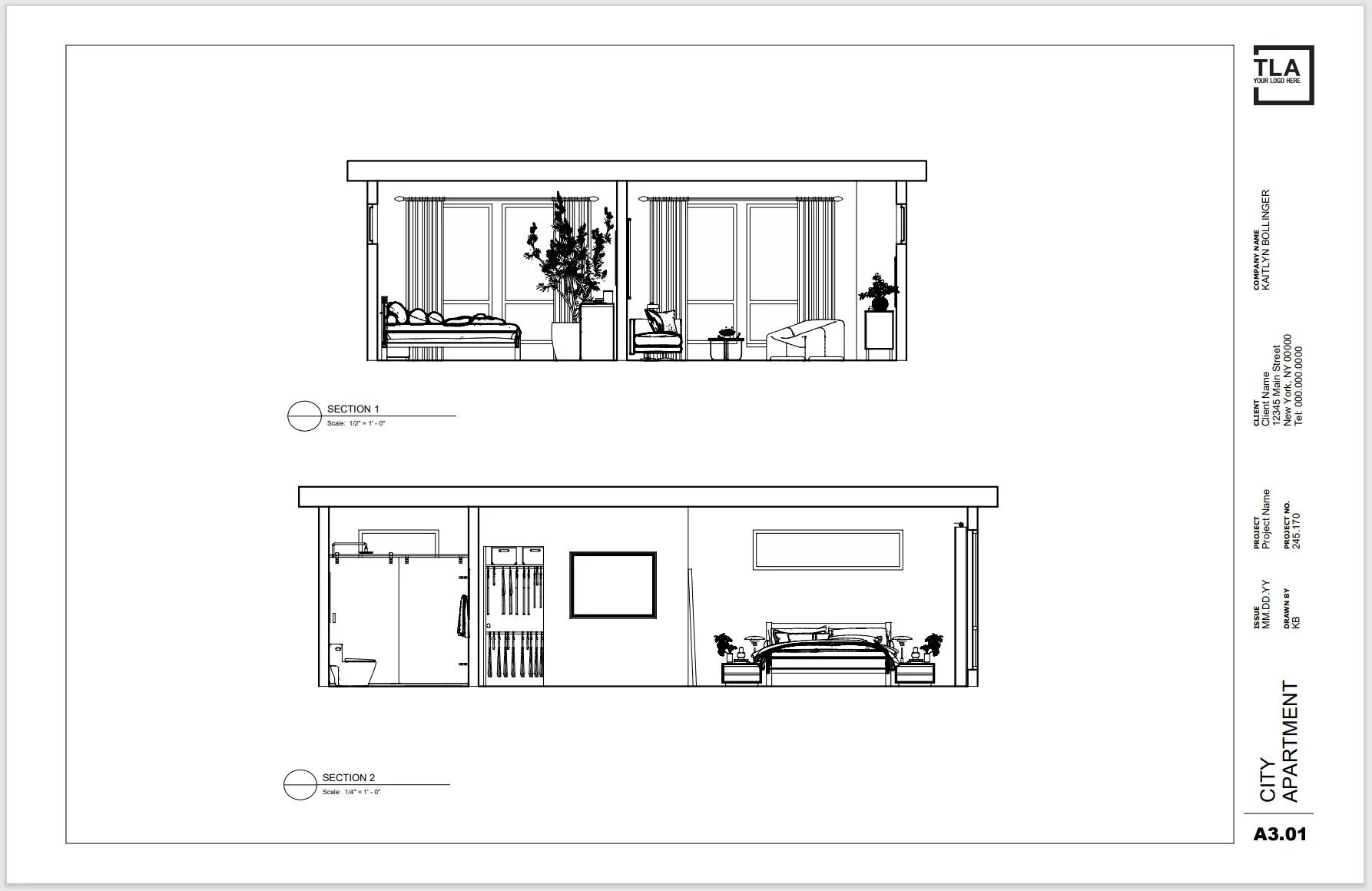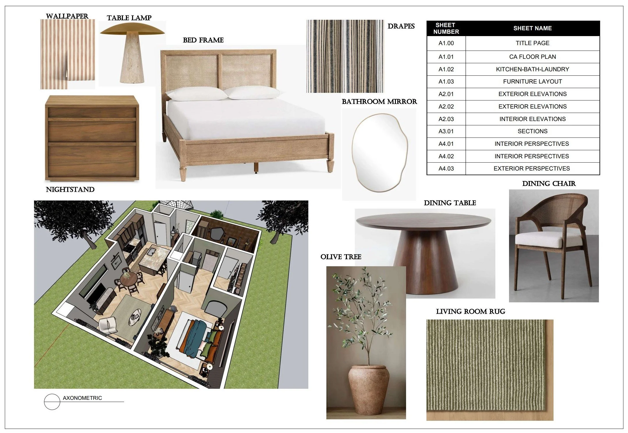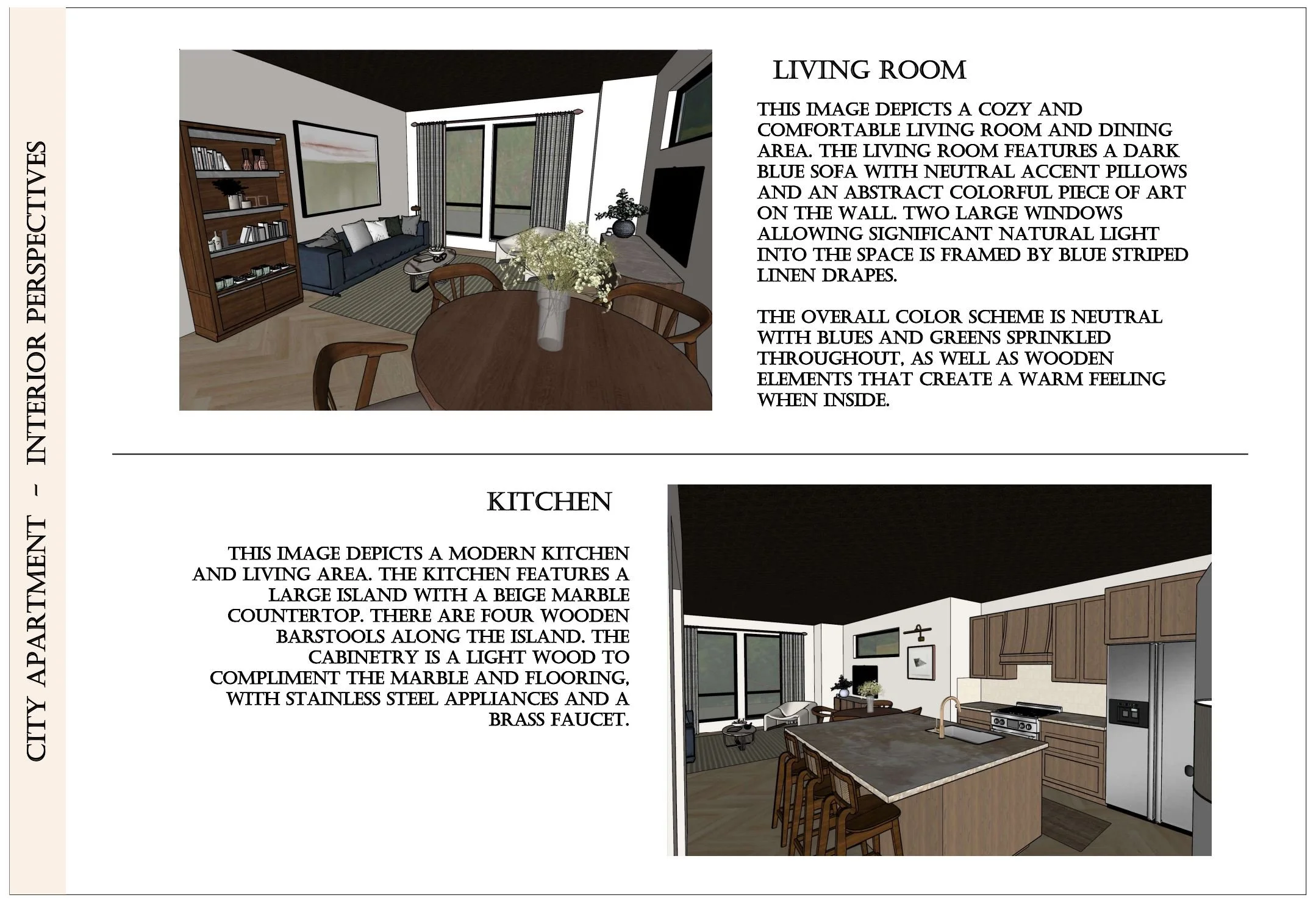 Construction document set of a one bedroom apartment, interior perspectives and axonometric view included, done in SketchUp and LayOut.